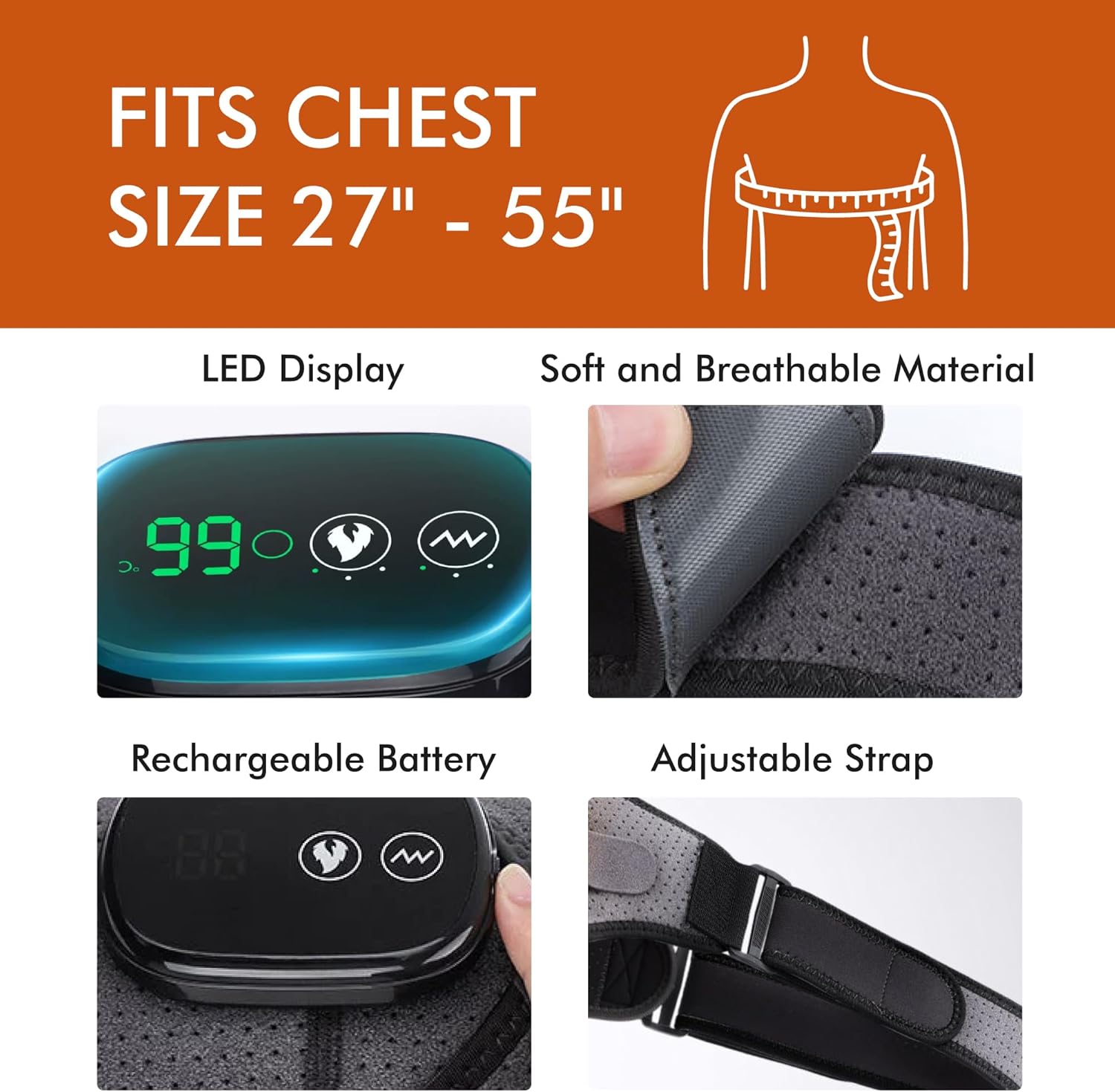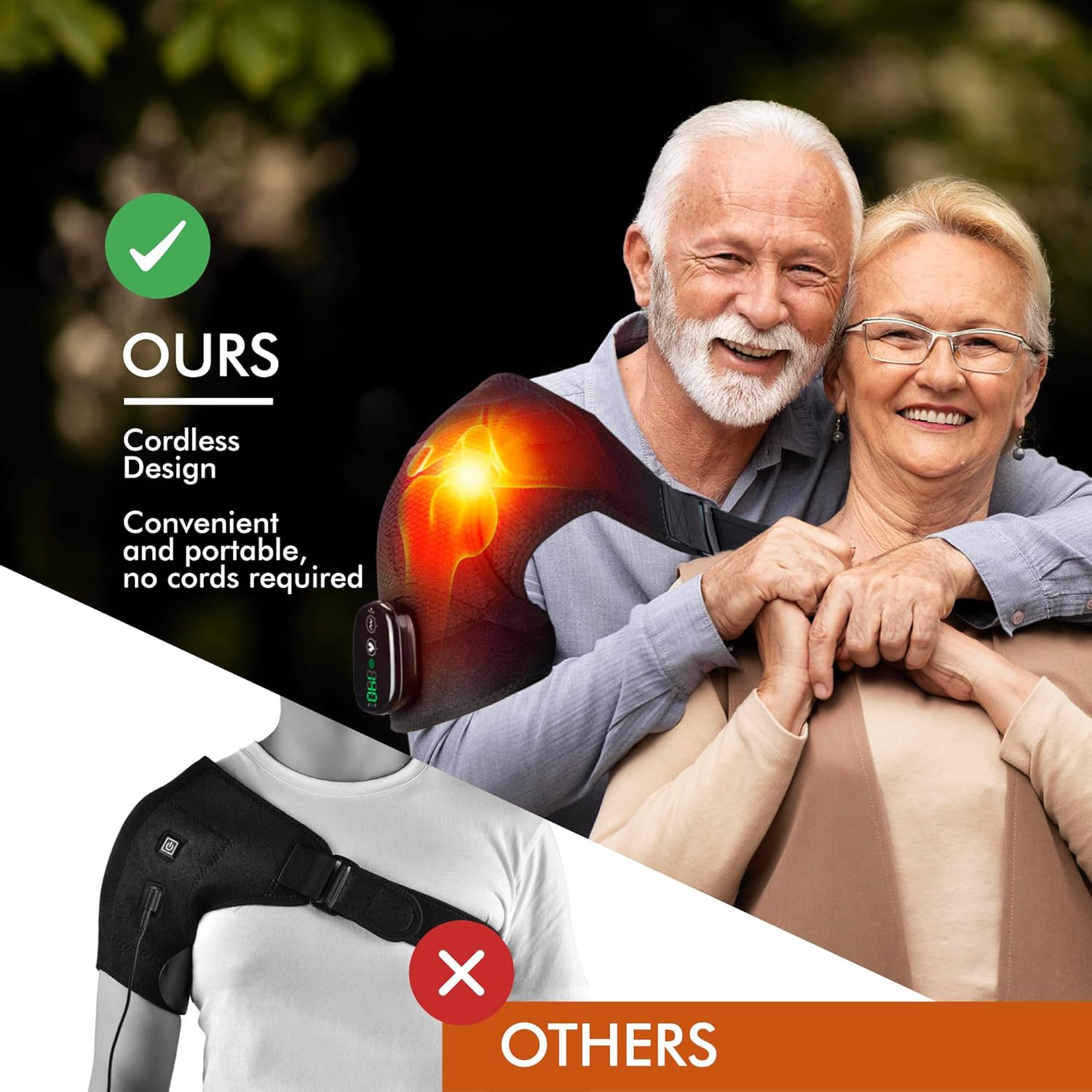 - Universal Fit for Comfort & Flexibility: Shoulder Heating Pad with Massage is designed to fit both left and right shoulders, this adjustable massager brace accommodates chest sizes from 27-55 inches and arm sizes from 9-16 inches. The extension strap offers a comfortable, adjustable fit for both men and women, offering a customizable experience. Cordless Shoulder Heating Pad is designed for shoulder comfort, aids in deep tissue therapy, and supports rotator cuff discomfort.