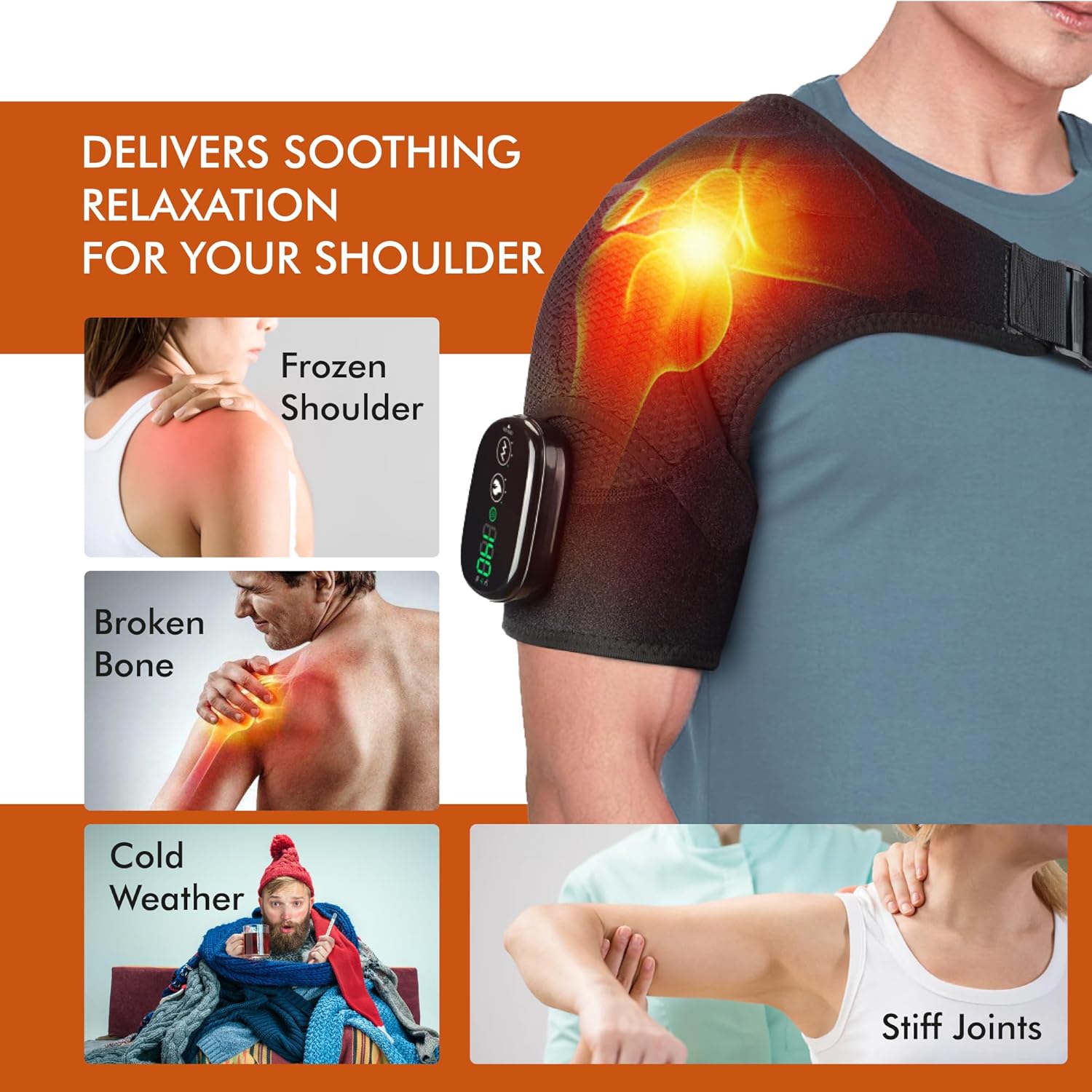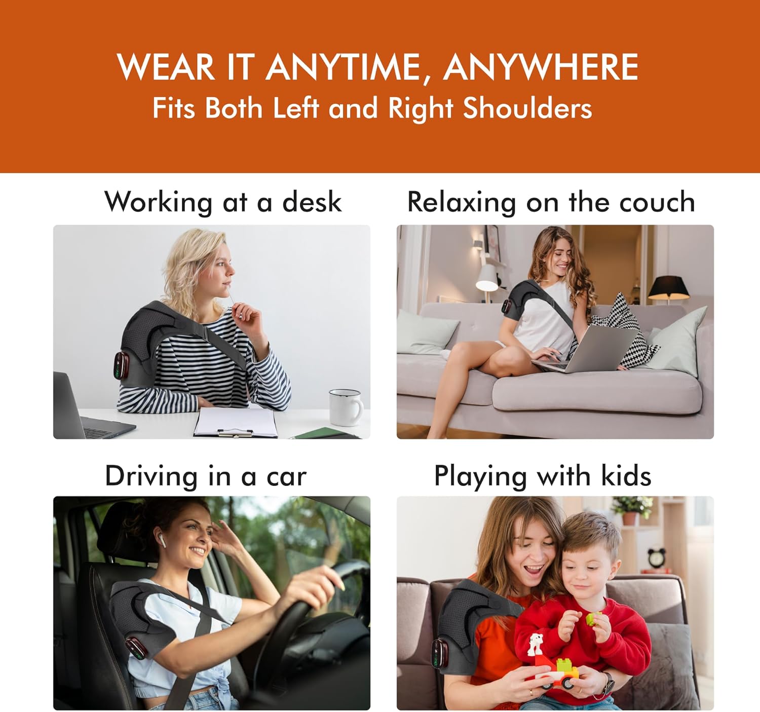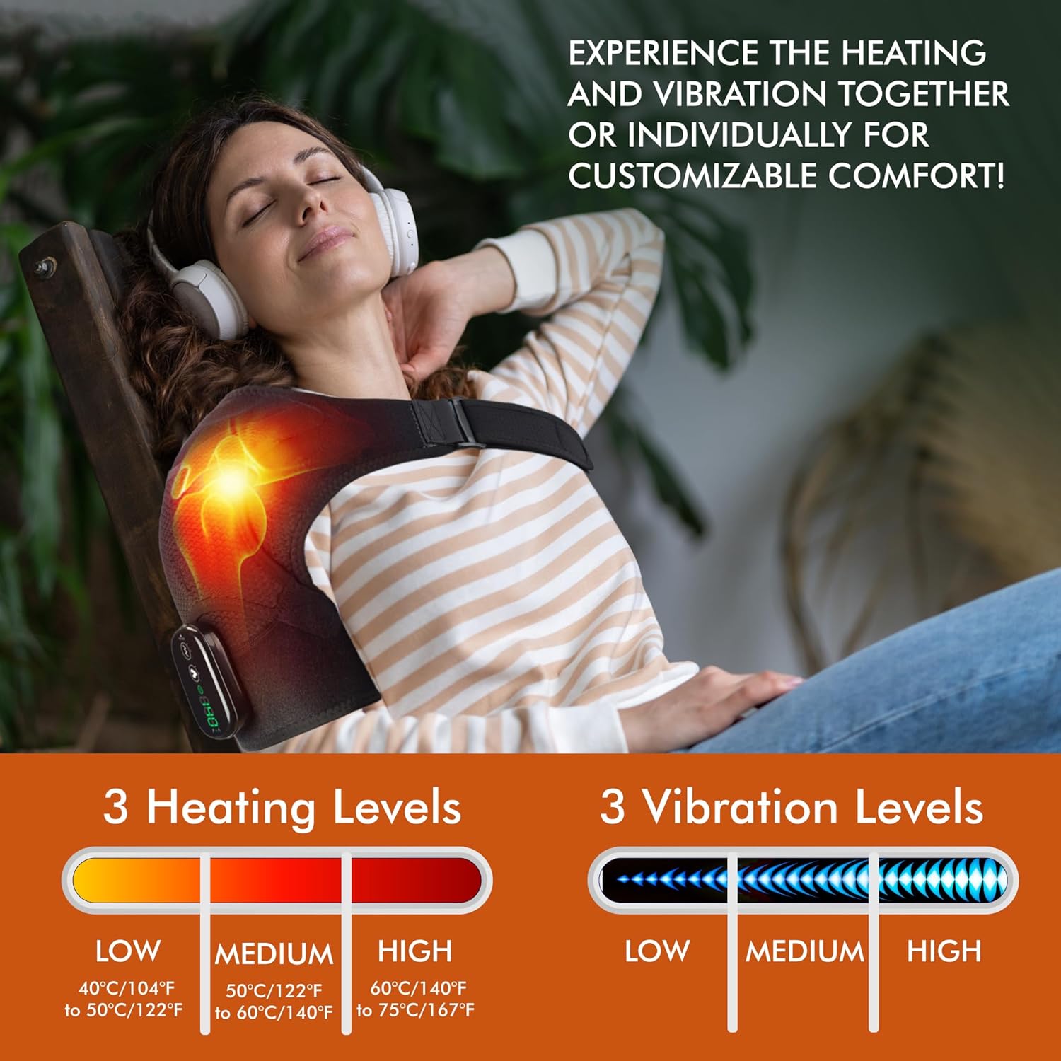 - Designed to Support Relaxation & Comfort: Heated Shoulder Wrap with Massage is made from soft, breathable neoprene, this 3-in-1 shoulder device is designed for comfort. It provides soothing heat and vibration, ideal for use during daily activities like working, driving, or relaxing, helping to offer shoulder comfort and relaxation. The Electric Shoulder Massager Machine has an adjustable brace fit that keeps it securely in place, allowing for hands-free use while you go about your day.